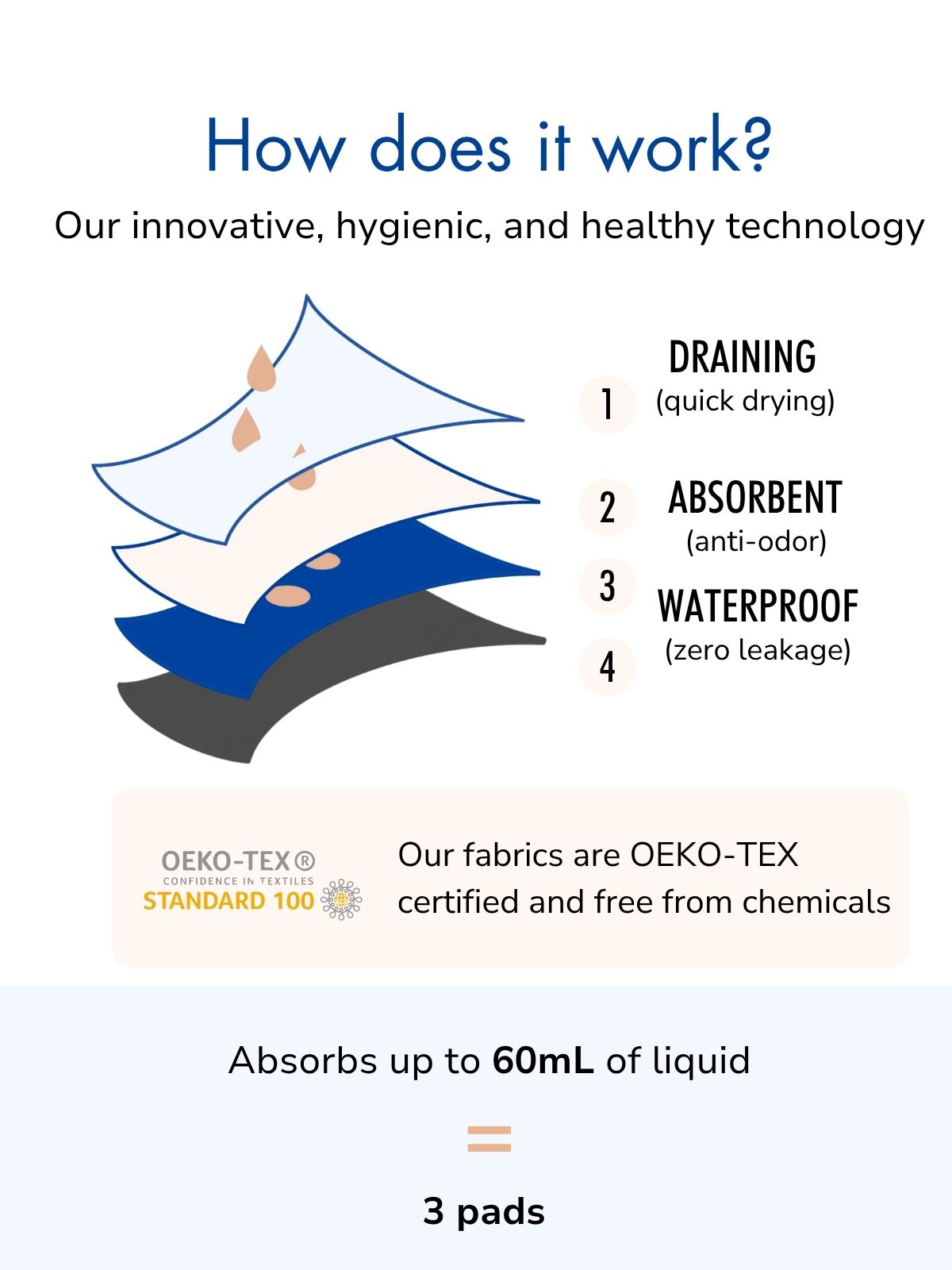 Washable and reusable for up to 5 years just like regular underwear, Octipa offers a cost-effective and eco-friendly alternative to expensive, environmentally harmful disposable pads.